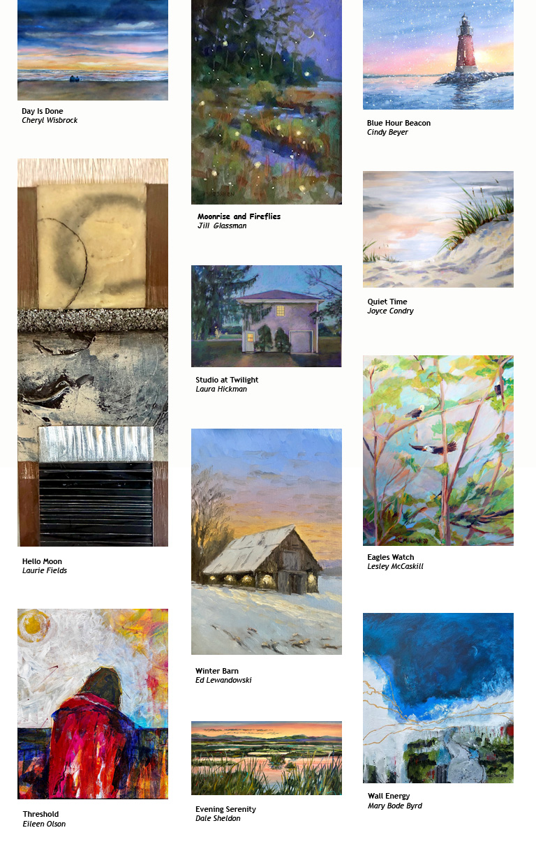 For artist Laura Hickman the fall time change transformed her art studio, “I began to see the interior lights illuminating my studio, bringing the beautiful twilight colors reflecting the magic time between light and dark. In artist Ed Lewandowski’s oil painting, “Winter Barn,” a snow-covered barn glows with golden warmth beneath a twilight sky, where fading hues of rose and indigo whisper the day’s last light. Cindy Beyer’s watercolor painting, “ Blue Hour Beacon,” twinkles in the twilight while lighting the way for the weary sea captains returning home, and artist Lesley McCaskill’s acrylic, “Eagles’ Watch,” pays homage to the majestic eagle guarding the twilight sky over the glade near her home. “Twilight is not an end, but a beginning disguised as an end.”